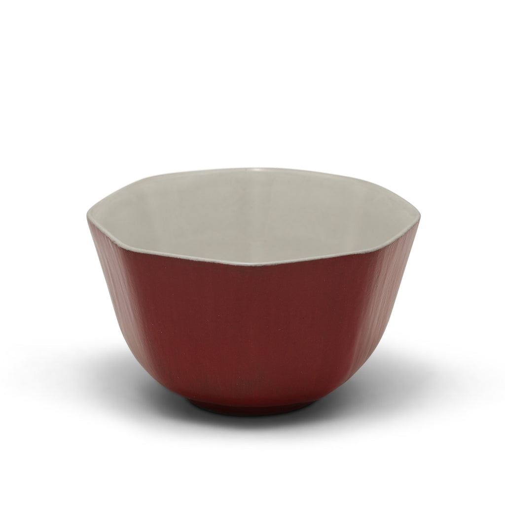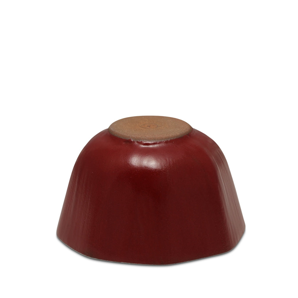 Die lackrote Glasur ist reichhaltig und attraktiv, und unter dem aus der Ferne soliden Erscheinungsbild sorgen subtile Wellen für eine interessante Oberfläche, die auf das dunkle Material darunter hinweist.