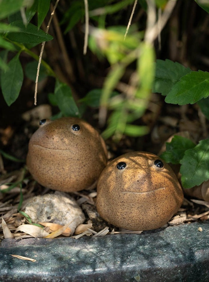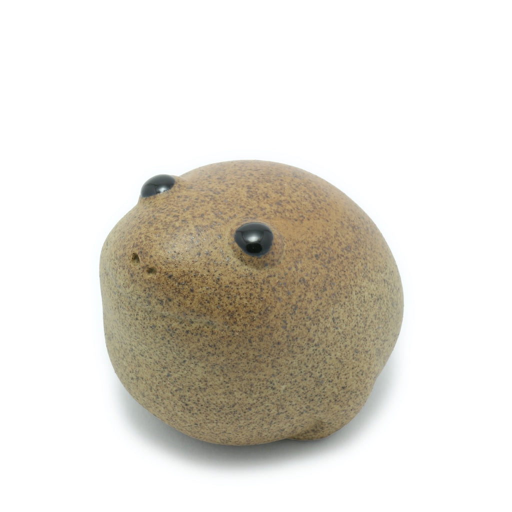 Ein Frosch, der sich in einer feuchten Umgebung wohlfühlt, ist eine gute Wahl, um in ausgeschüttetem Tee gebadet zu werden. Das Glückssymbol des Jin Chan alias Chan Chu, eines dreibeinigen Frosches, der mit Münzen verziert ist und in ostasiatischen Geschäften auf der ganzen Welt zu finden ist - und somit auch in Teeläden - ist doppelt passend. Umso amüsanter ist es, dass der Designer die traditionell furchteinflößende und verzierte Ikonografie zugunsten eines Jin Chan neu interpretiert hat, der eher einem aufgeblasenen Regenfrosch ähnelt. Dieser dreibeinige Begleiter aus gesprenkeltem Ton mit großen schwarzen Augen ist mit Sicherheit ein niedlicher Begleiter für Ihre Gongfu Cha-Sitzungen.