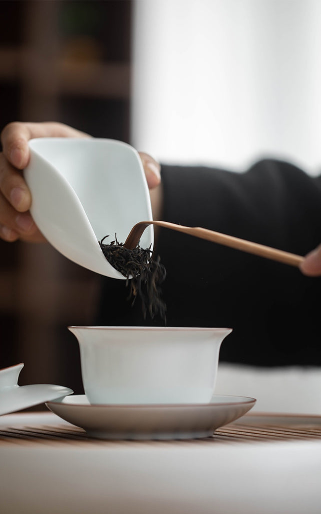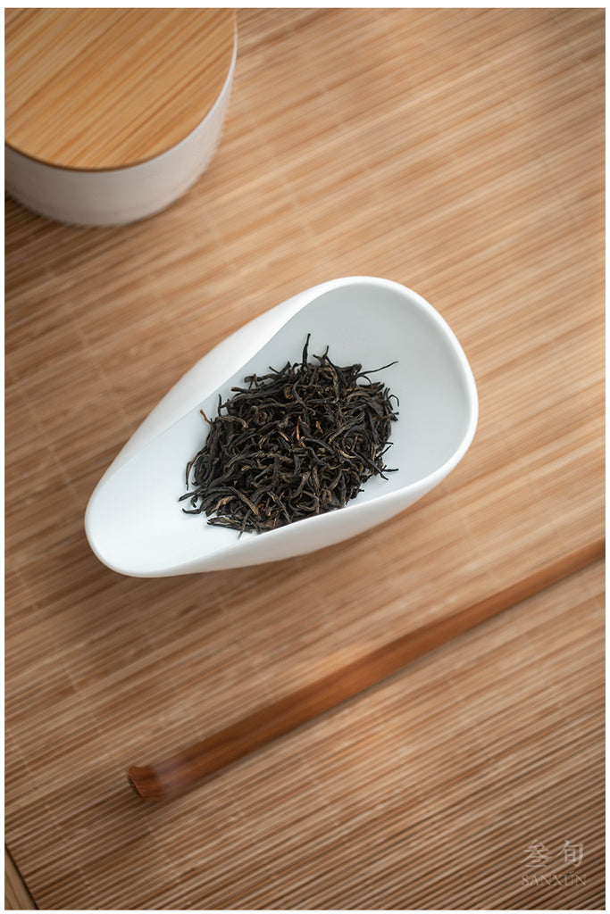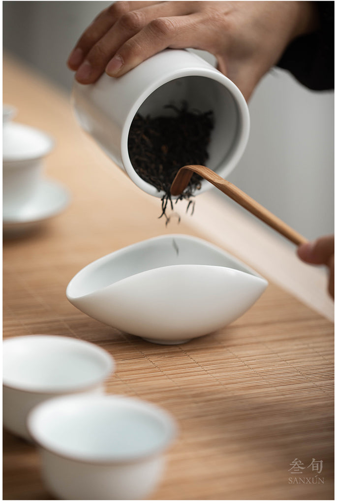 In diesem eleganten und schlanken Teelotus lassen sich die Blätter mühelos präsentieren und abmessen. Aus cremiger, strahlend weißer Keramik gefertigt, sind die Farbe und die Konturen der trockenen Blätter gut zu erkennen. Sein einfaches, aber effektives Design in Form eines gefalteten Blütenblattes ermöglicht das Befüllen am größeren Ende und das Einfüllen in einen wartenden Gaiwan oder eine Teekanne am schmaleren Ende. Das teilweise geschlossene Becken lenkt die Aromen in Richtung einer neugierigen Nase, was für die Zubereitung von hochwertigem Tee sehr wichtig ist, während die schrägen Seiten für einen ergonomischen Griff sorgen. Ein wichtiges Accessoire für jeden Gongfu-Cha-Tisch.