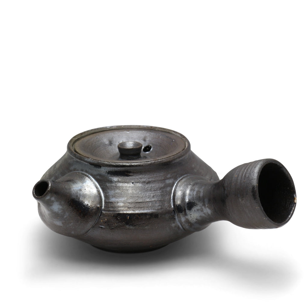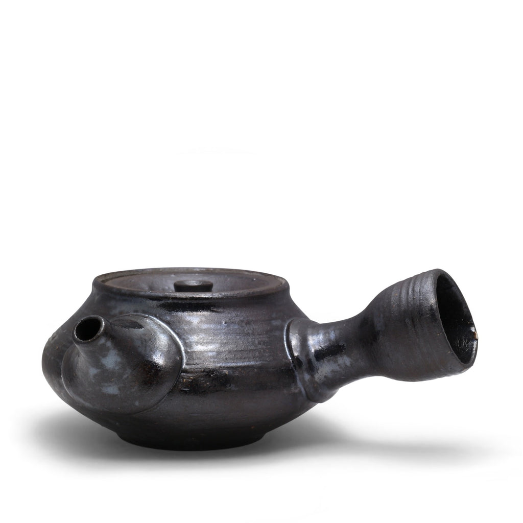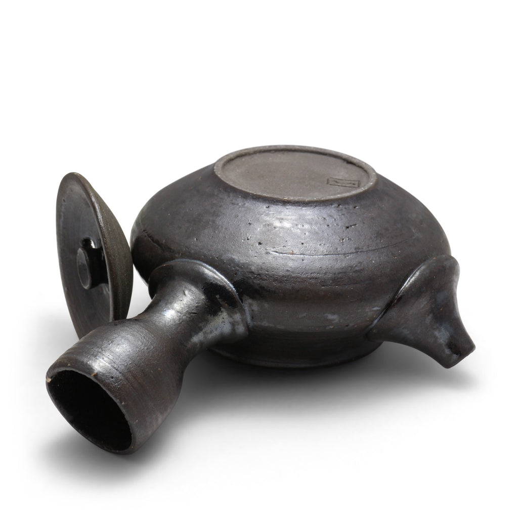 Die aus Steinzeugton gefertigte und mit einer tiefen holzkohlefarbenen Glasur überzogene Kanne mit Seitenhenkel strahlt eine erdige Intensität aus. Die abgerundete Silhouette, die der der elfenbeinfarbenen Version gleicht, wird durch einen kräftigen Ausguss und einen skulpturalen Seitengriff ergänzt, der sich in der Hand beruhigend anfühlt.
