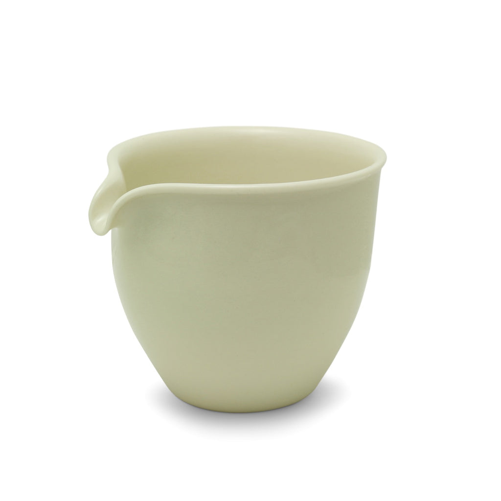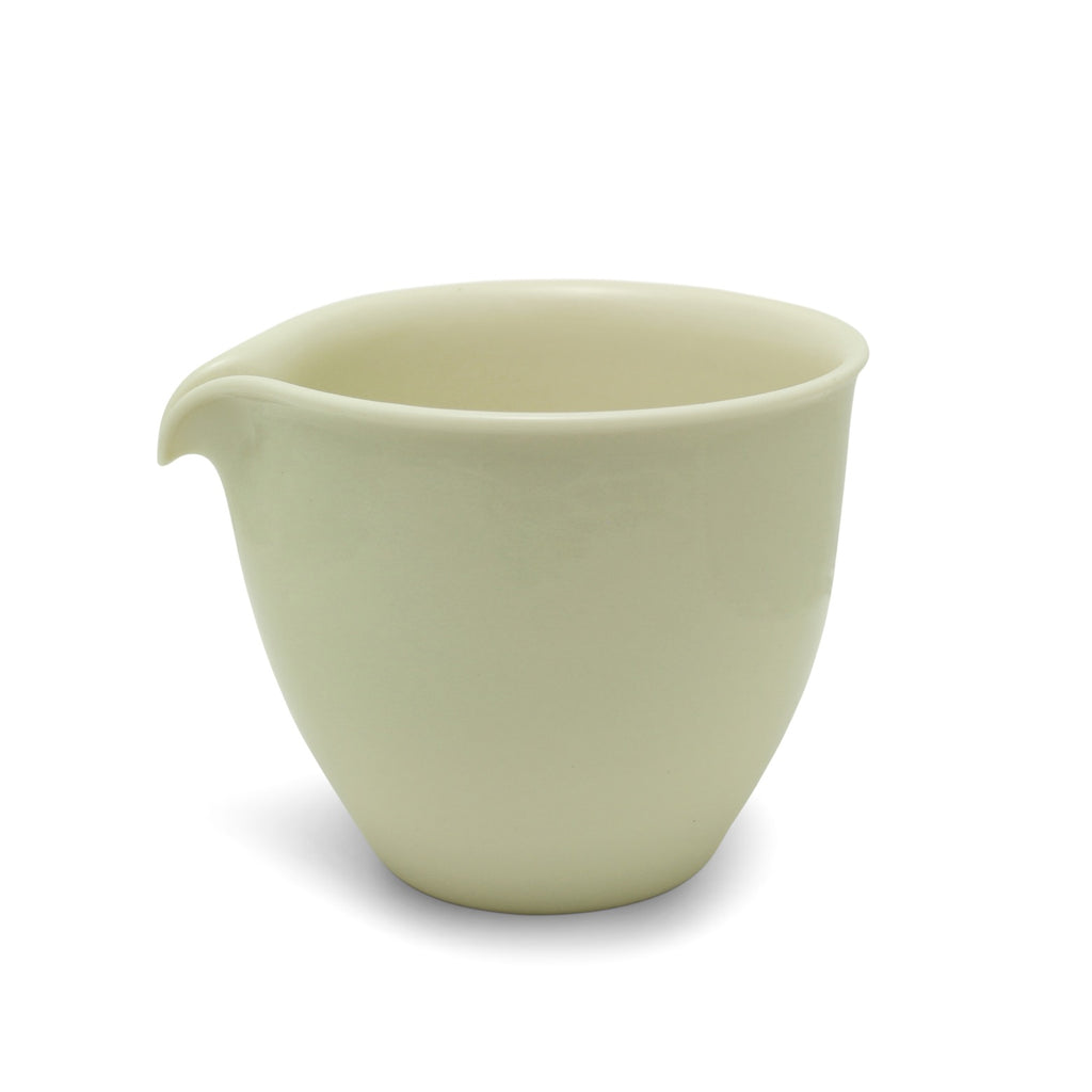 Dieser Krug ist ein wenig hübscher als nötig, denn er hat einen gewölbten Bauch und eine elegante Tülle, die sich wie die Lippe einer Lilie windet. Er ist vollständig mit einer undurchsichtigen Glasur überzogen, deren cremiger Farbton aus einer alten Rezeptur mit Pflanzenasche stammt. Bei näherer Betrachtung zeigt sich ein Handwerk von so feiner Präzision, dass seine Herkunft aus der Manufaktur fast verborgen bleibt. Dieser Krug suggeriert, dass hinter dem, was das Auge sieht, mehr steckt, und lädt neugierige Finger dazu ein, seinen Schwerpunkt zu finden und die delikate Angelegenheit des Einschenkens von Tee zu genießen.