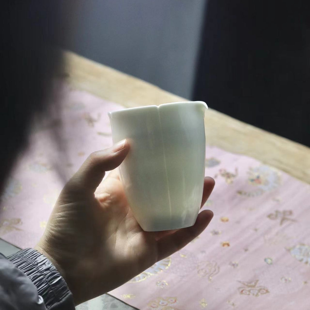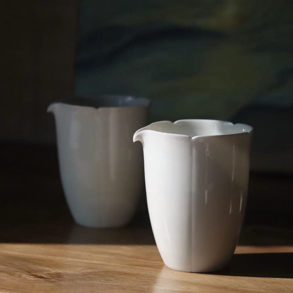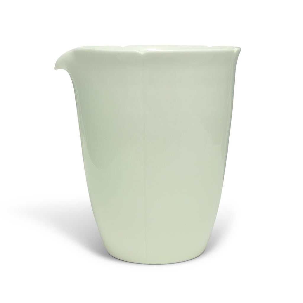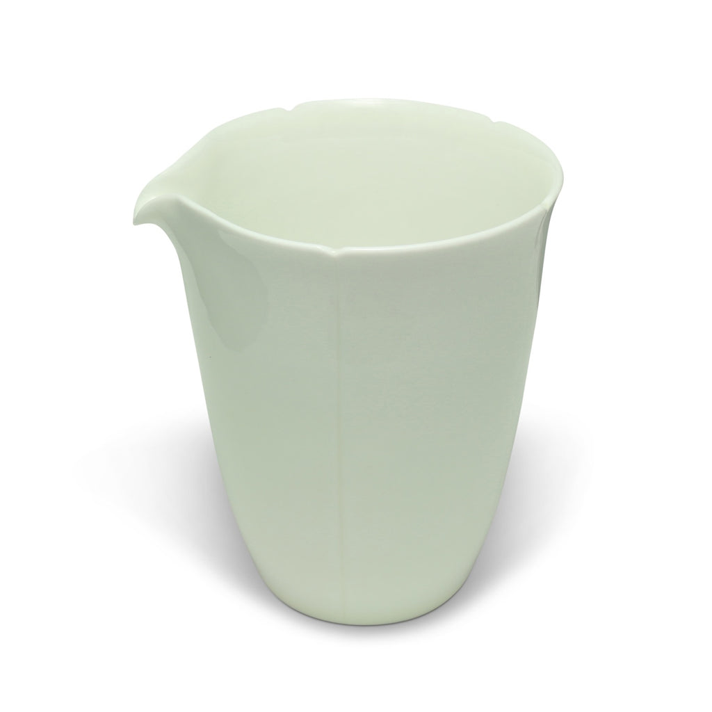 Dieser längliche Krug mit seidenweicher, nicht ganz weißer Glasur liegt äußerst angenehm in der Hand. Eine sorgfältige, sich verjüngende Formgebung hat den Boden dicker und isolierender gehalten, während der dünne Rand raffinierter wirkt und eine gute Ausgießkontrolle bietet. Mit nur vier dünnen Linien an der Seite, die in handgeschnittenen Kerben enden, hat die Künstlerin ein klassisches Motiv in eine vereinfachte, volkstümliche Form gebracht - die Öffnung soll an eine sich öffnende Sonnenblume erinnern -, so dass sie sowohl mit verziertem als auch mit minimalem Teegeschirr kombiniert werden kann.