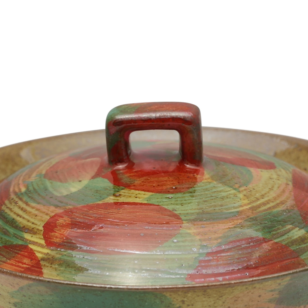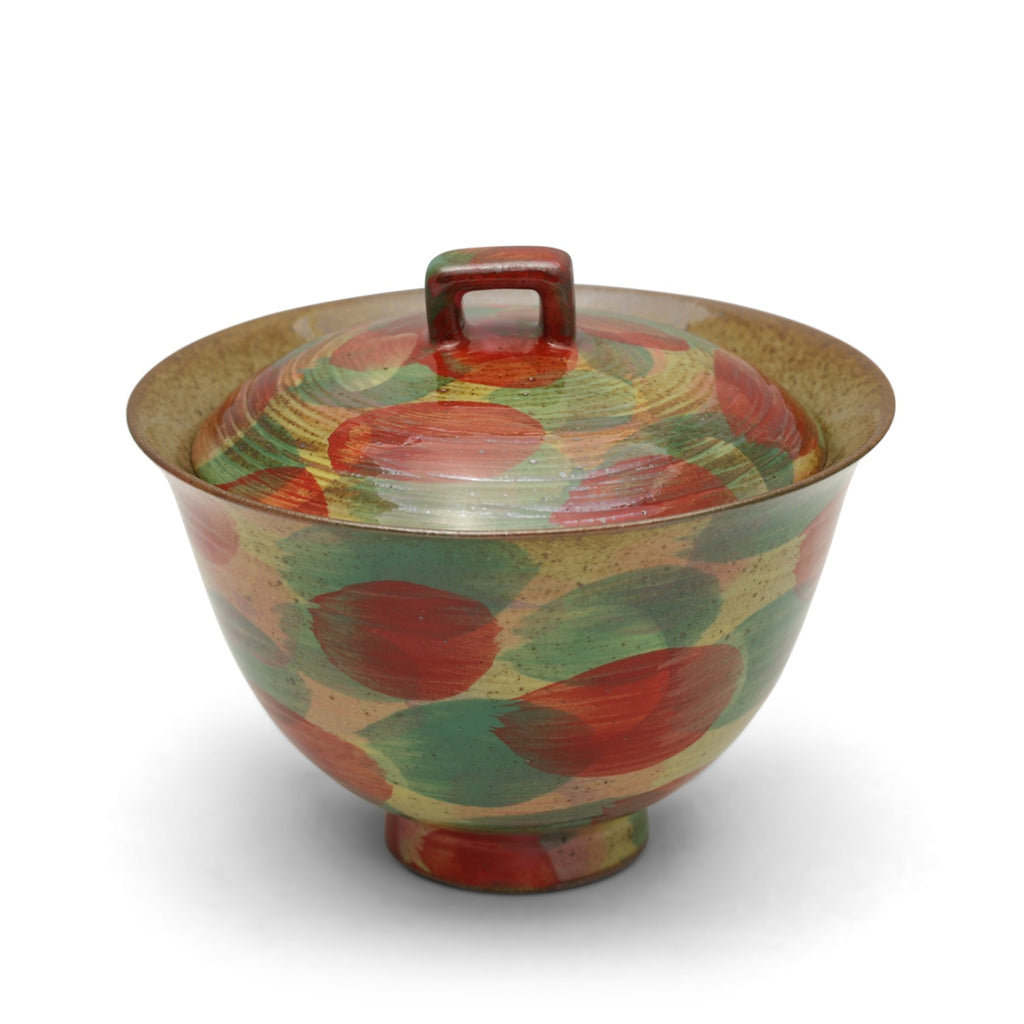 Dieser Gaiwan ist ein lebhaftes Meisterwerk, das Sie in eine Welt spielerischer Raffinesse einlädt. Seine Form ähnelt einer zarten Glocke, als hätte ein fröhlicher Kunsthandwerker ihre Melodie eingefangen und sie mit kräftigen Pinselstrichen in Rot und Grün bemalt. Die lebhaften Muster erinnern an die Wärme von Herbstblättern oder an einen blühenden Garten, während der strukturierte, gesprenkelte Hintergrund einen erdigen Charme versprüht, der die lebendige Energie zurück auf den Boden holt. Der quadratische Henkel des Deckels verleiht ihm ein modernes Flair und verbindet nahtlos Zweckmäßigkeit mit Kunstfertigkeit. Dieser Gaiwan ist mehr als nur ein Teegefäß, er zelebriert Kreativität und Handwerkskunst und bringt Freude und Vergnügen in jeden Aufguss.
