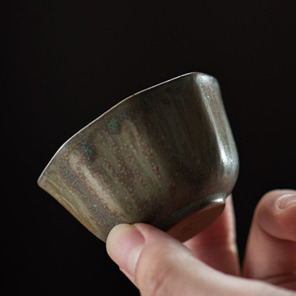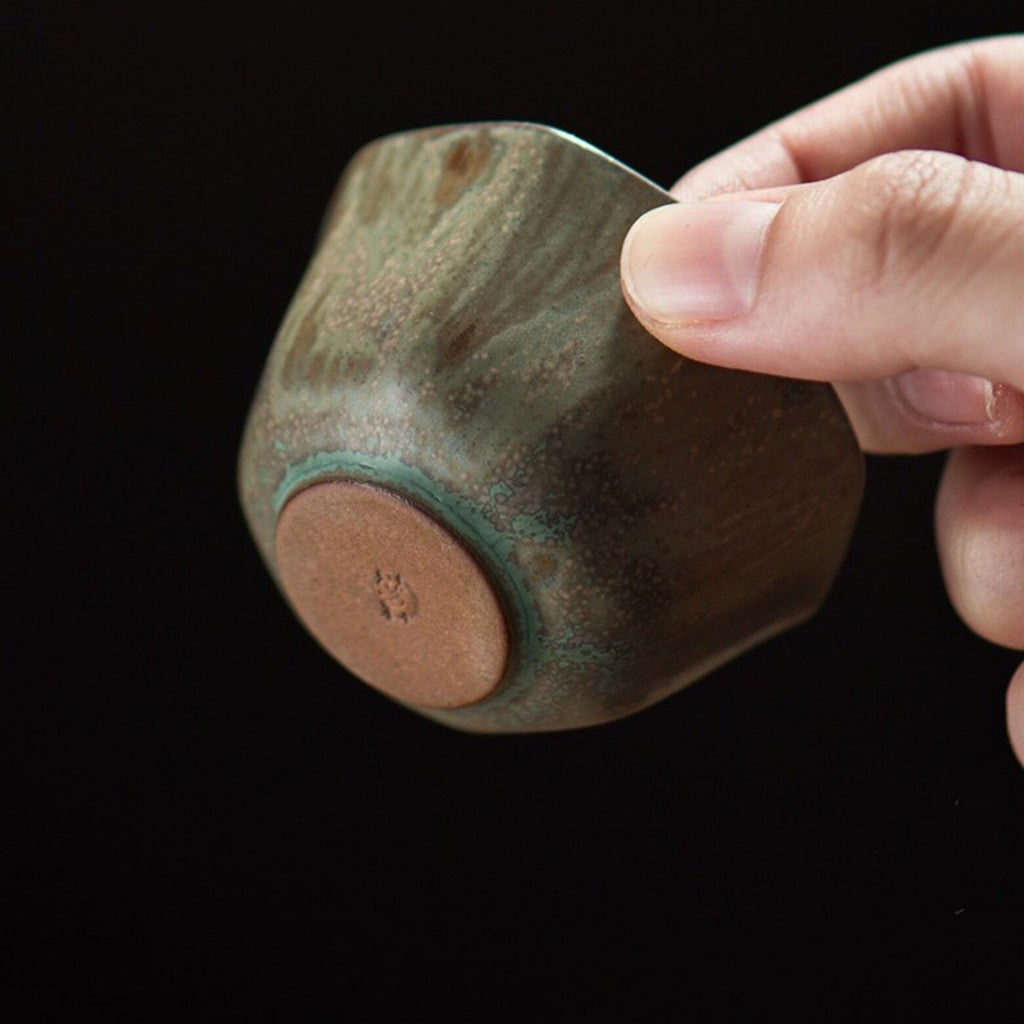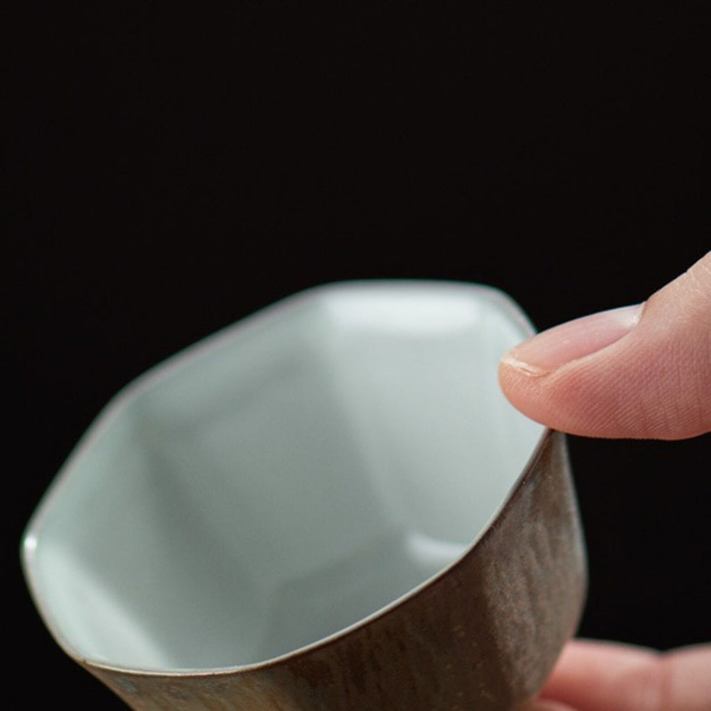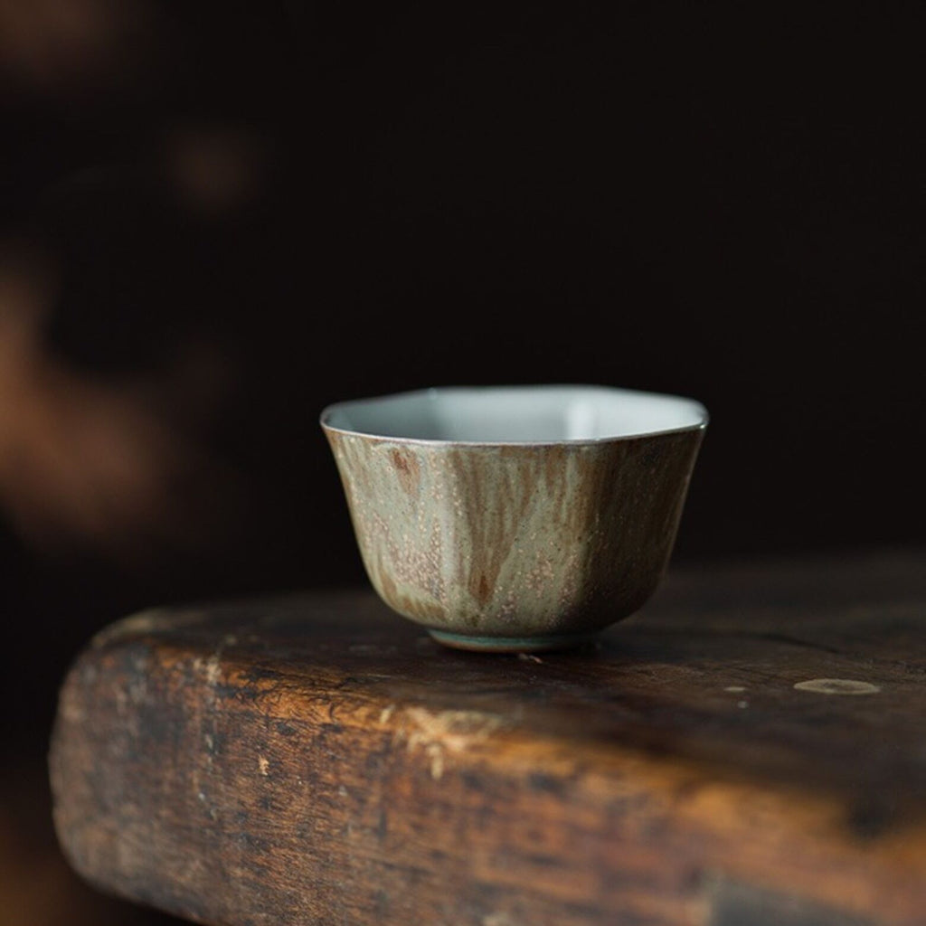 Diese glasierten achteckigen Tassen wurden von unserer Discord community ausgewählt, als wir in China nach Teegeschirr suchten. Der „Eierschalen“-Stil ist ungewöhnlich für Nicht-Porzellan-Keramik, wie man an dem rötlich-braunen Material am Fuß erkennen kann. Die dünnen Wände, die sich auf nur wenige Millimeter verjüngen, sind nicht nur beeindruckend, sondern sorgen auch dafür, dass die Schalen luftig leicht in der Hand liegen. Das weiche Achteck mit seiner leicht strukturierten Außenglasur trägt zur Haptik bei, während die kühle, cremefarbene Innenglasur die Farbe des Aufgusses schön zur Geltung bringt. Das macht diese Schalen zu perfekten Alltags-Gongfu-Tasse für alle, die Farbe und Textur gegenüber rein weißer Keramik bevorzugen.