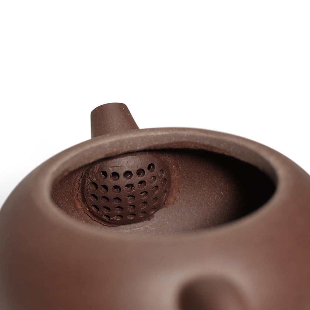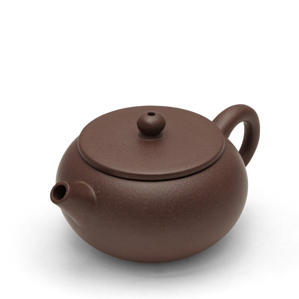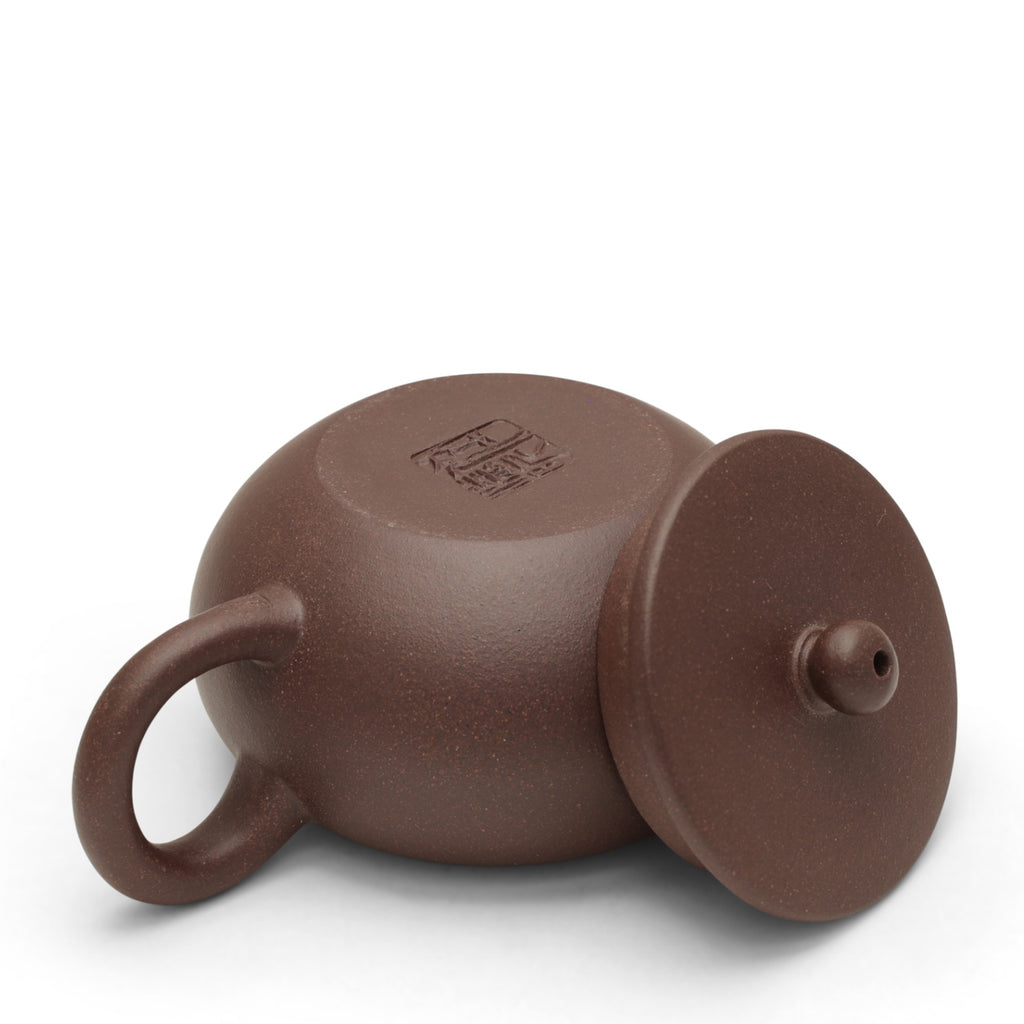 Das Zini-Erz, aus dem dieser Topf gefertigt ist, hat eine satte Farbe, die hervorragend zu Form und Motiv passt. Dieser Topf ist auch aus Lao Zhuni-Ton erhältlich, nur etwas kleiner, da dieses Erz beim Brennen unterschiedlich stark schrumpft.