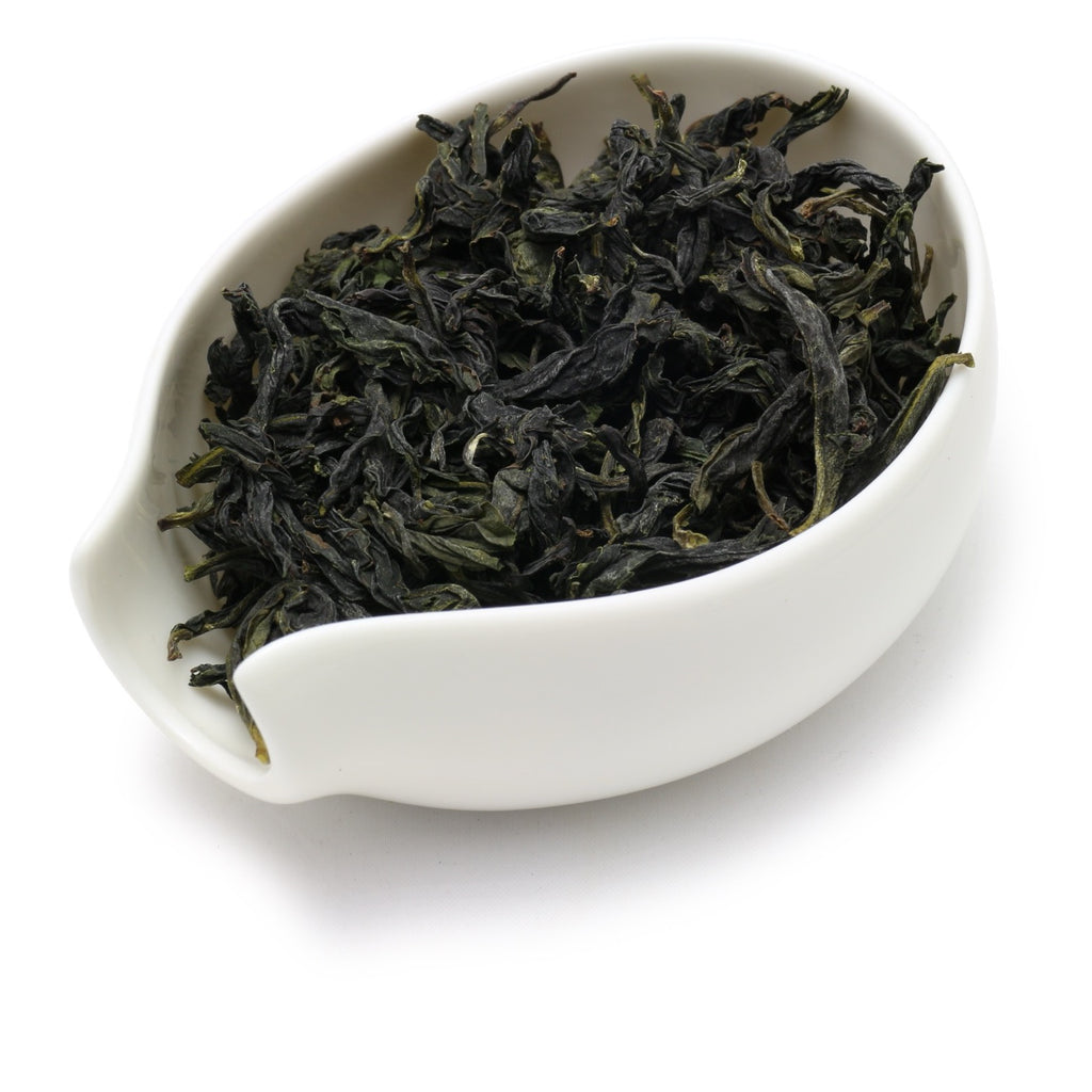 Die dunklen Blätter weisen bereits auf eine traditionelle Verarbeitung hin und unterscheiden sich damit von den heute überwiegend anzutreffenden hellgrünen Baozhong-Teesorten.