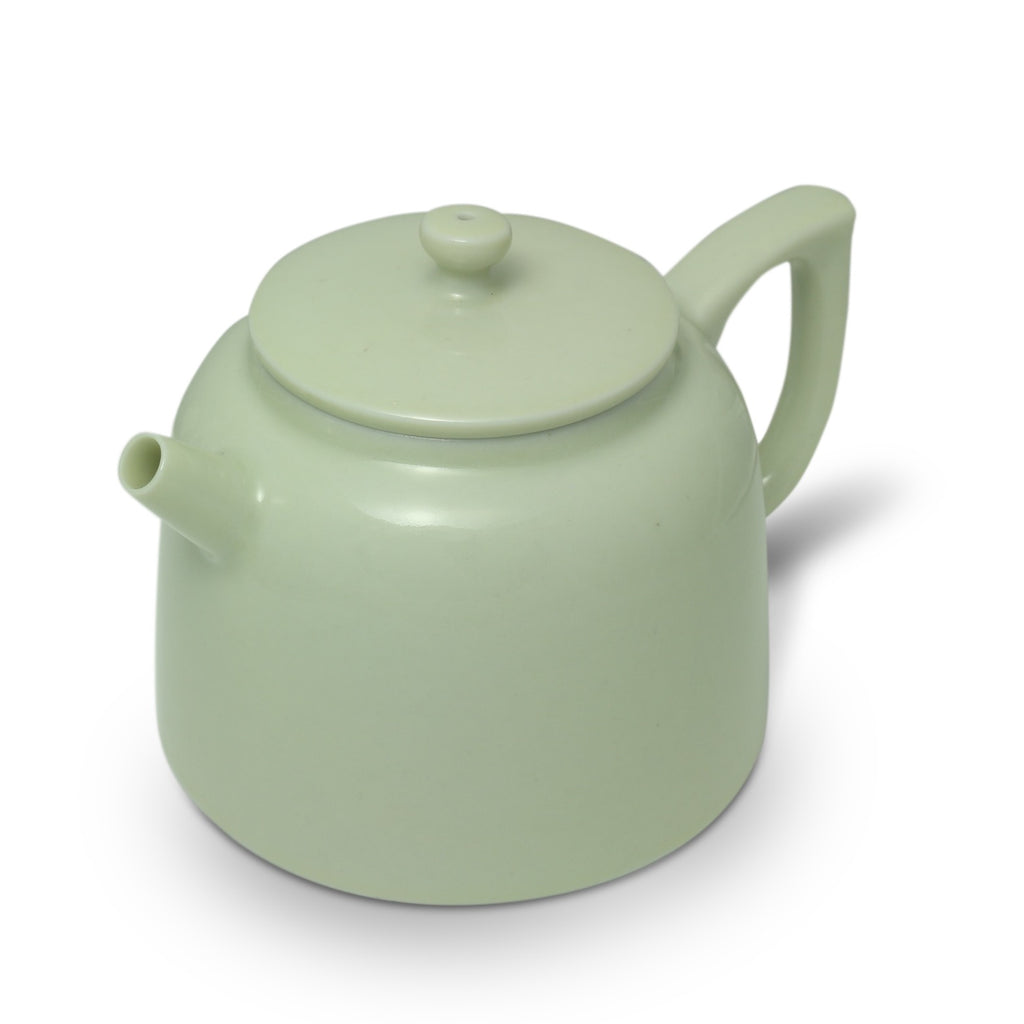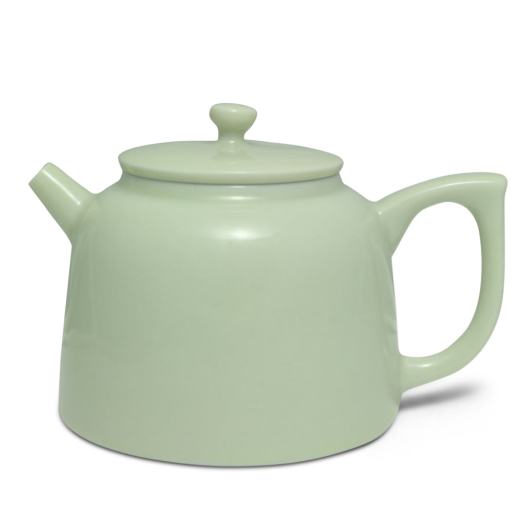 Diese kleine, subtil goldfarbene Teekanne ist aus feinem, glasiertem Jingdezhen-Porzellan gefertigt, so dass sie im Gegensatz zu einer unglasierten Teekanne aus Ton für mehrere Teesorten verwendet werden kann. Die einfache, moderne Form mit subtilen formalen Akzenten, wie die Verjüngung des Korpus und eine Zackenspitze am Henkel, begünstigt auch die Verwendung als alltägliche Teekanne oder für Gongfu Cha, wenn ein flexibleres Gefäß als ein Yixing gesucht wird.